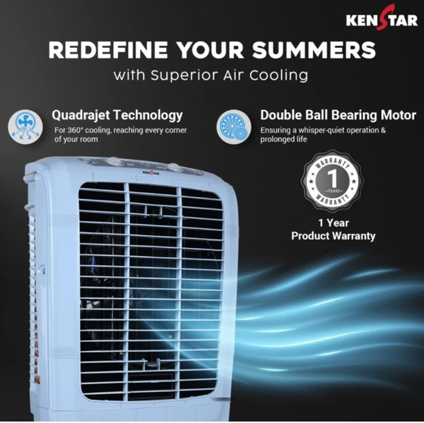 Keeping your room cool and relaxed during summers is now easy, thanks to the Kenstar Cool Grande 60 L Desert Air Cooler. It has a capacity of up to 60 L that eliminates the need for frequent refilling and ensures optimal performance. With its high air delivery rate of up to 4300 cubic metres per hour, this air cooler provides optimal cooling even in large rooms. Furthermore, courtesy of its honeycomb cooling pads, this air cooler provides improved cooling performance for long durations.