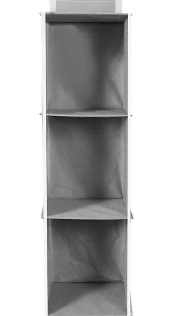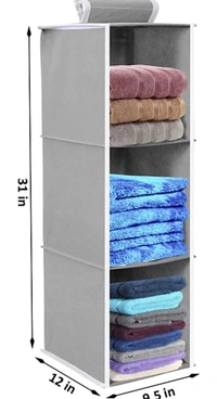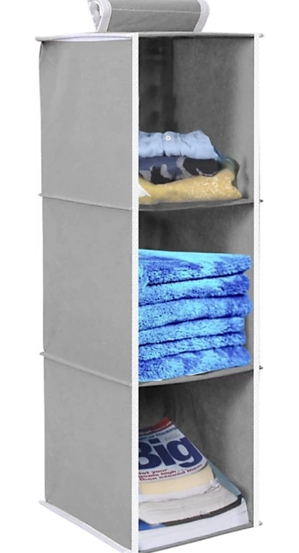 3 compartment hanging shelf clothes organizer helps you organize your wardrobe or bathroom neatly and systematically. It is made from heavy 80 GSM non-woven fabric with engineered wood inside. All the 3 compartments have hard engineered wood base to make it strong and durable and take the weight of whatever is stored in it as compared to similar products available which have cardboard base only on top & bottom 3 shelf wardrobe organizer has a strong loop fastener which hangs easily on any bar/rod creating 3 extra shelves in your wardrobe, to keep your wardrobe neat and clean.