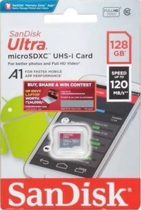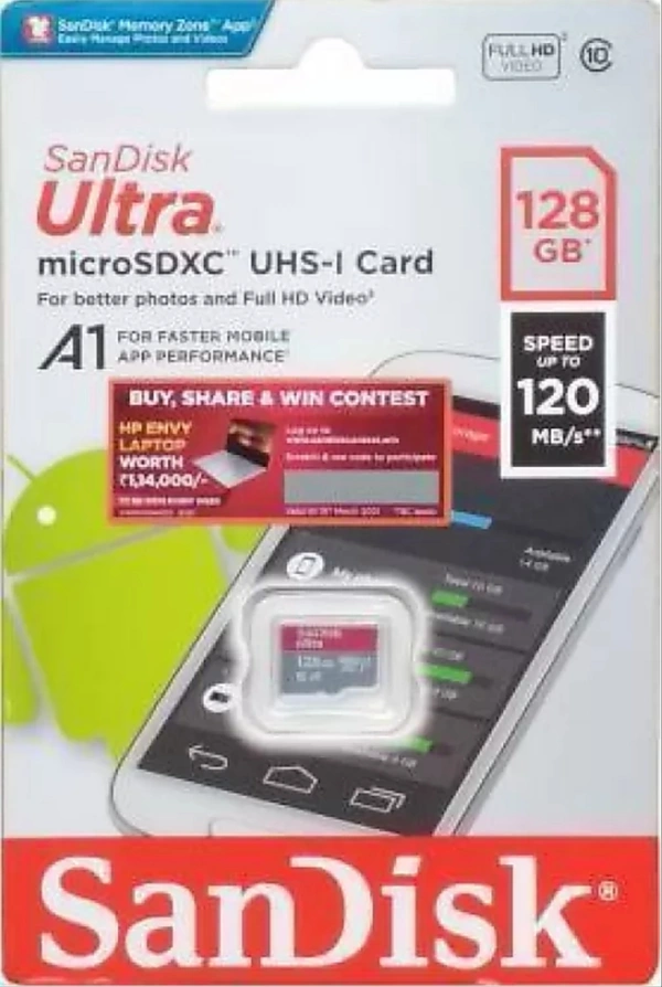 Key Features • For Mobile • Capacity: 128 GB • MicroSD Card • Class 10 . • Read Speed: 120 MB/s General Sales Package 1 Memory Card Pack of 1 Series A1 Model Number SDSQUA4-128 Warranty Covered in Warranty Memory Card Warranty Service Type Repair/ Replacement Not Covered in Warranty Broken/ Damage Warranty Summary 10 Year Domestic Warranty 10 Year
